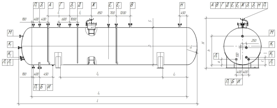 Обозначение Наименование Размеры в зависимости от объёма аппарата А Ввод продукта 20–350 Б Вывод продукта 20–350 В Вывод газа 20–350 Г Дренаж 20–350 Д Для пропарки 20–350 Е Для предохранительного клапана 50–150 Ж Для встроенного уровнемера по запросу И Резервный 20–350 К Для термометра по запросу Л Для термоэлектрического преобразователя по запросу М Для манометра М20х1,5 Н Для указателя уровня 20–50 П Люк-лаз 450 Ю1,2 Для камеры уровнемера 20–350 -