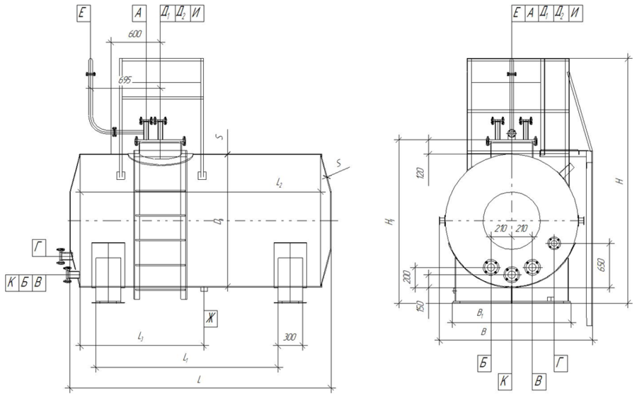Обозначение Назначение Кол-во Проход условный, Ду, мм Давление условное, Ру, МПа Тип уплотнительной поверхности А Для наполнения 1 80 1,0 Гладкая Б Для раздачи 1 80 1,0 В Для зачистки 1 50 1,0 Г Для вентиляции 1 50 0,6 Д Люк замерный 1 50 1,0 Е Для входа теплоносителя 1 — — — Ж Для выхода теплоносителя 1 — — — -
